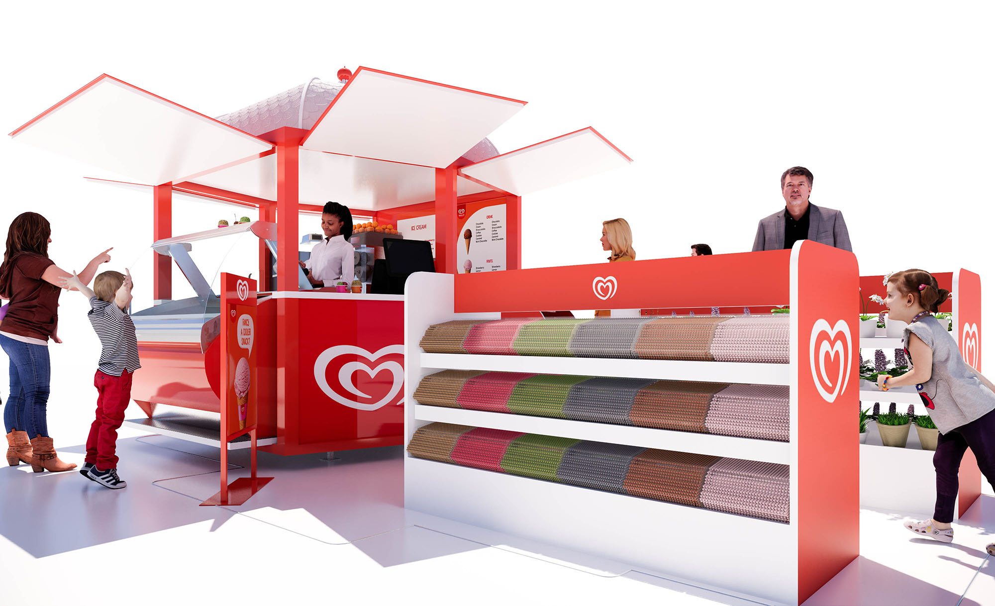The FRIGO project is conceived as a recognizable, modular ice-cream environment that can be replicated across different sites in Spain and Portugal, from airports to malls and outdoor plazas. The design translates the brand’s playful character into a clear architectural language based on bold geometry, intense color fields and immersive graphics. The space is understood as a compact, high-visibility pavilion that radiates energy and warmth, turning the act of buying an ice cream into a short but memorable spatial experience.