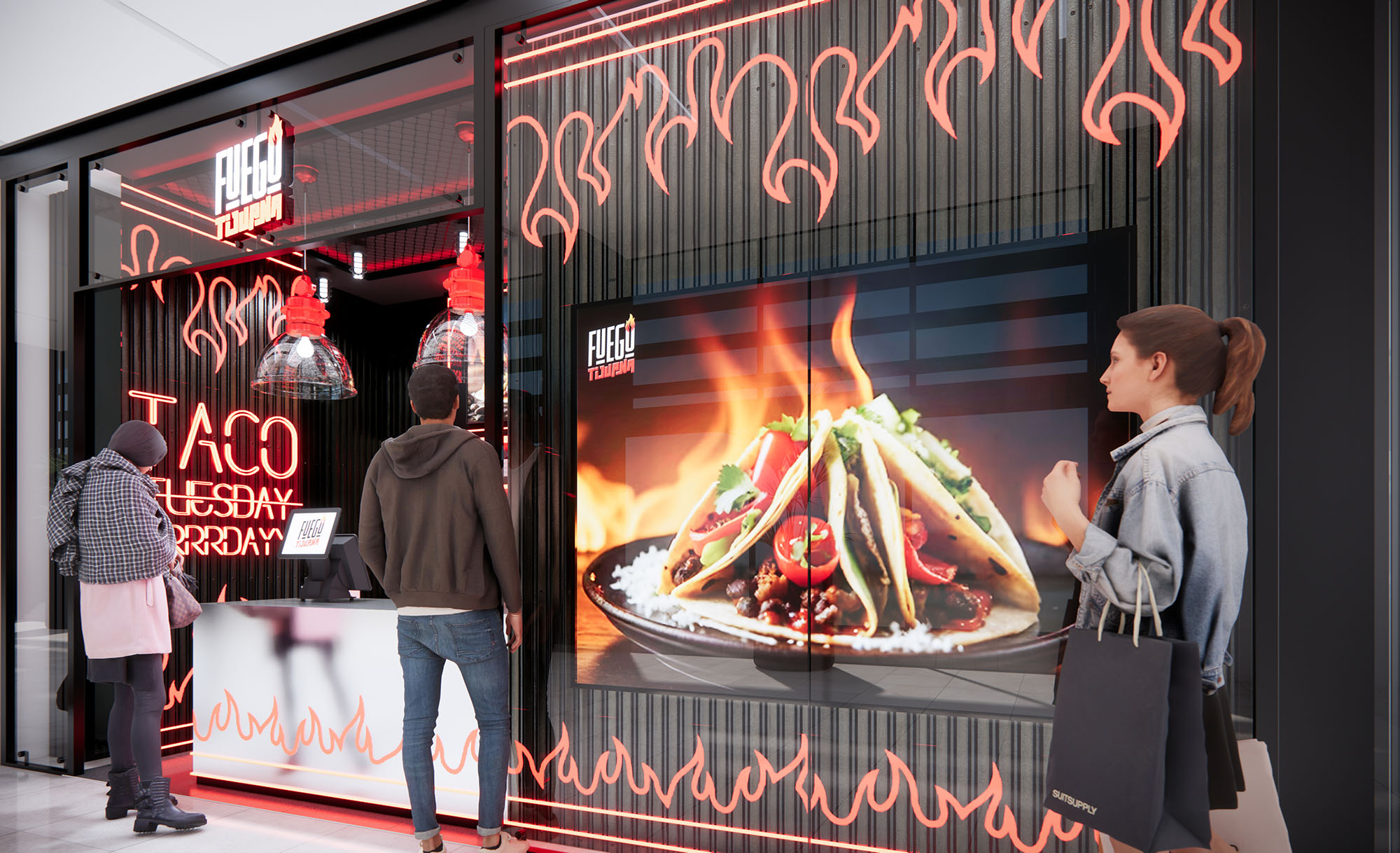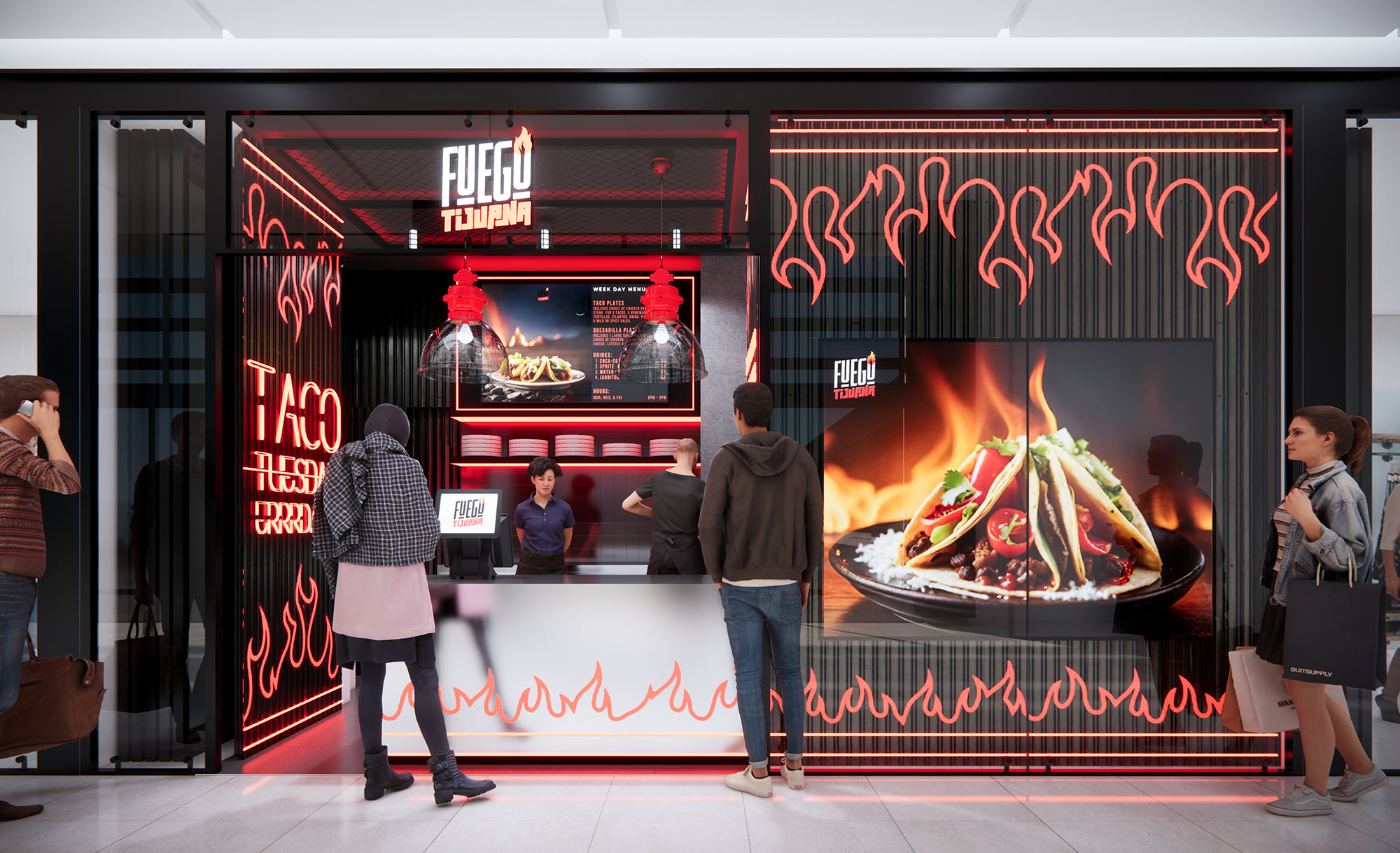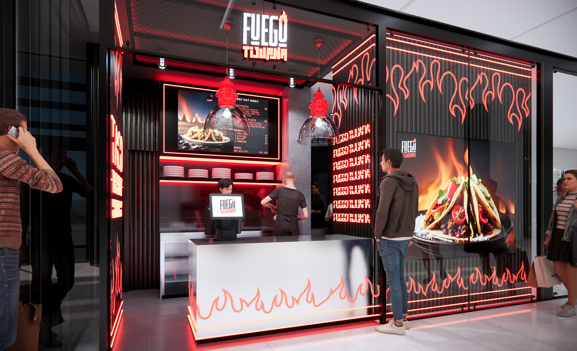 FUEGO is conceived as an urban food counter that translates the intensity of open flame cooking into a compact architectural statement. The design uses light, color, and graphics to evoke heat and movement, projecting the gastronomic experience directly onto the shopping mall corridor. The goal is to create a recognizable visual icon that communicates speed, freshness, and bold flavor within a minimal footprint.