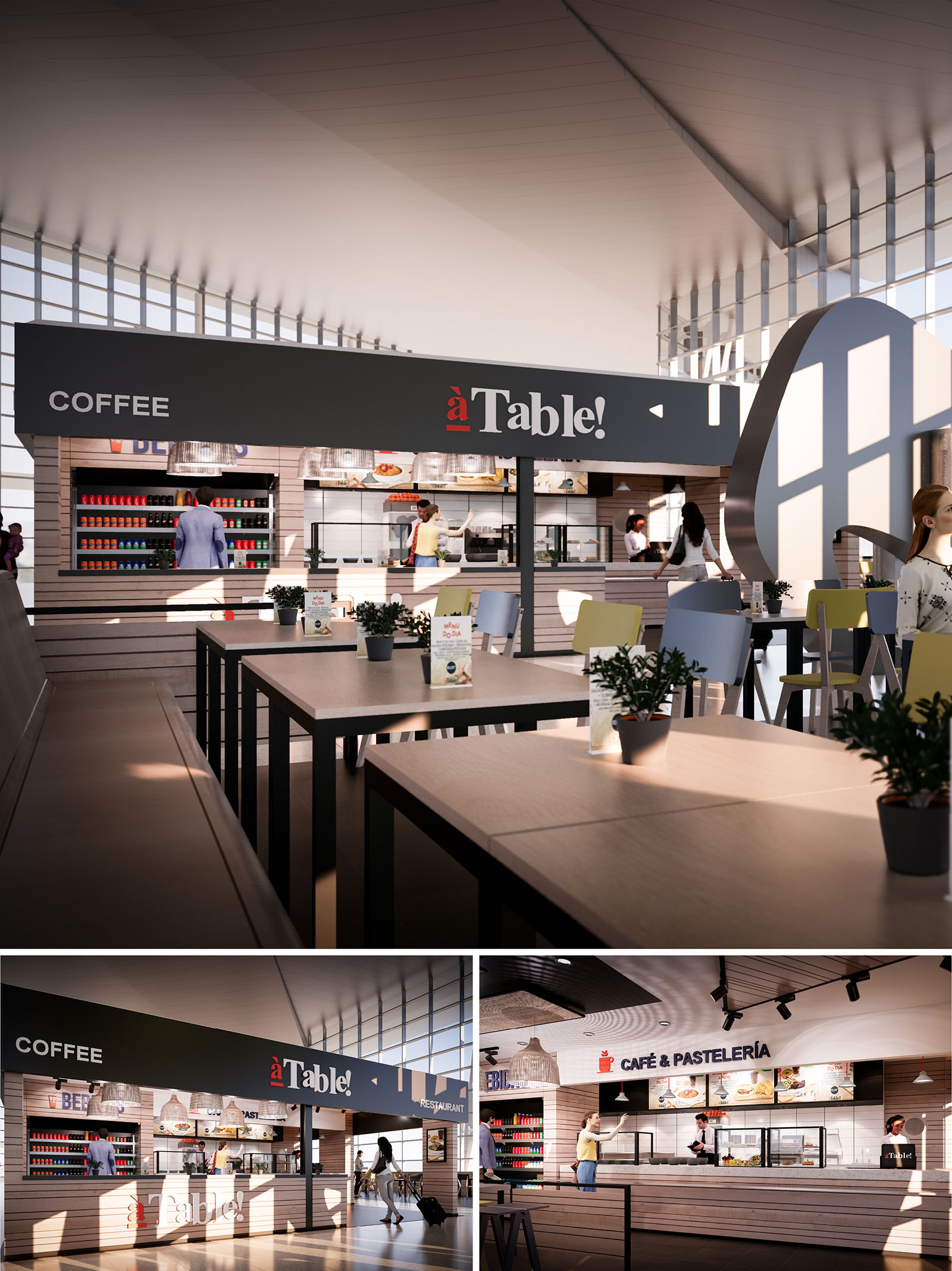 The “À Table” project is conceived as a contemporary food hall island within the dynamic context of Oporto’s airport. The design seeks to create a clear and recognizable identity in a high‑flow environment by using an iconic horizontal canopy and a strong graphic language. The architectural gesture is deliberately simple: a linear bar that organizes service, display and circulation, framed by a dark overhead band that acts as both sign and shelter.