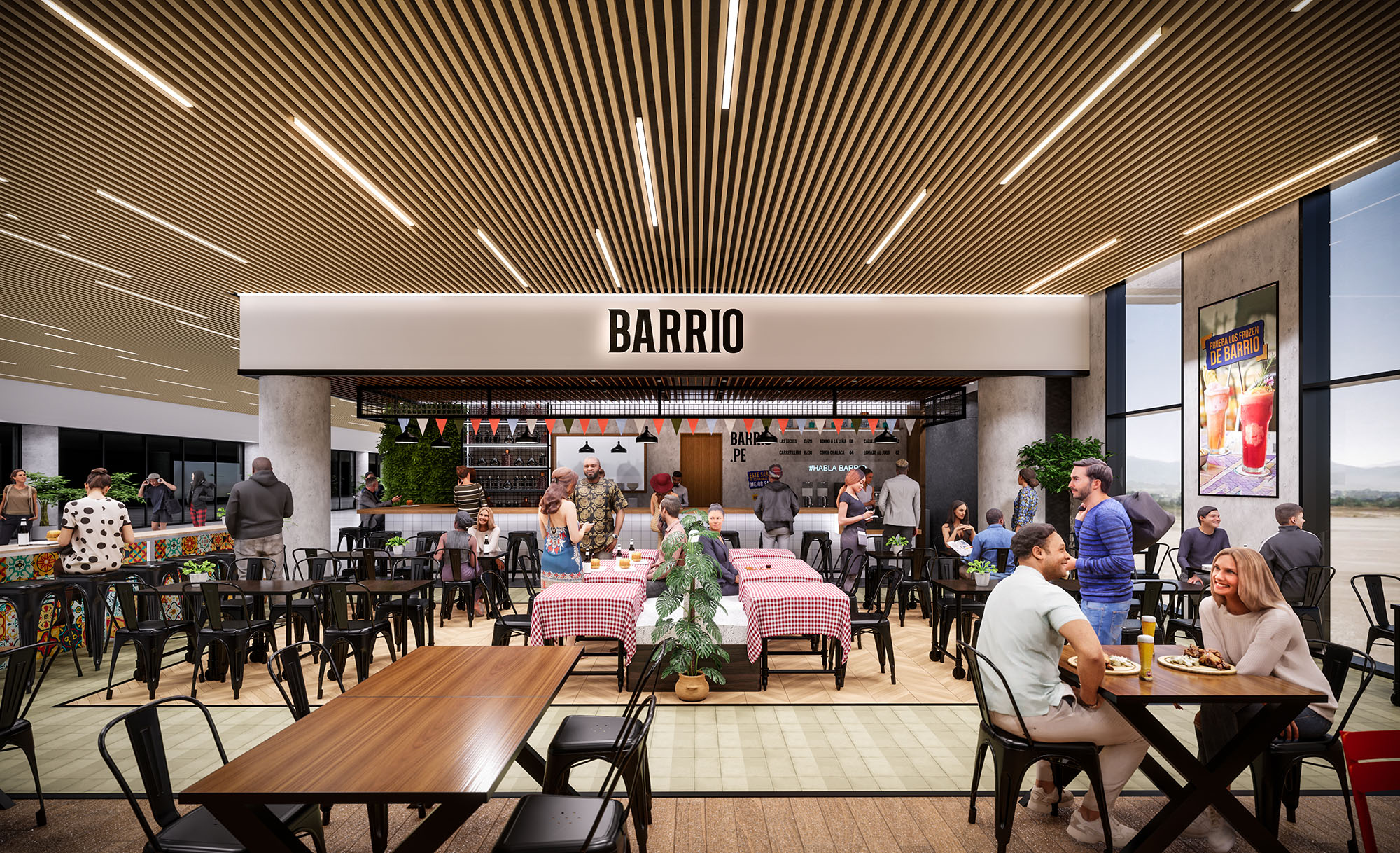 BARRIO is conceived as an open, informal urban dining space that evokes the atmosphere of a traditional Lima neighborhood within the controlled environment of a shopping mall. The project merges the spontaneity of street food and local markets with a clear, contemporary architectural language. The design prioritizes visual permeability, a festive character, and a sense of collective table, making the food court stall read as a small plaza rather than a closed restaurant.