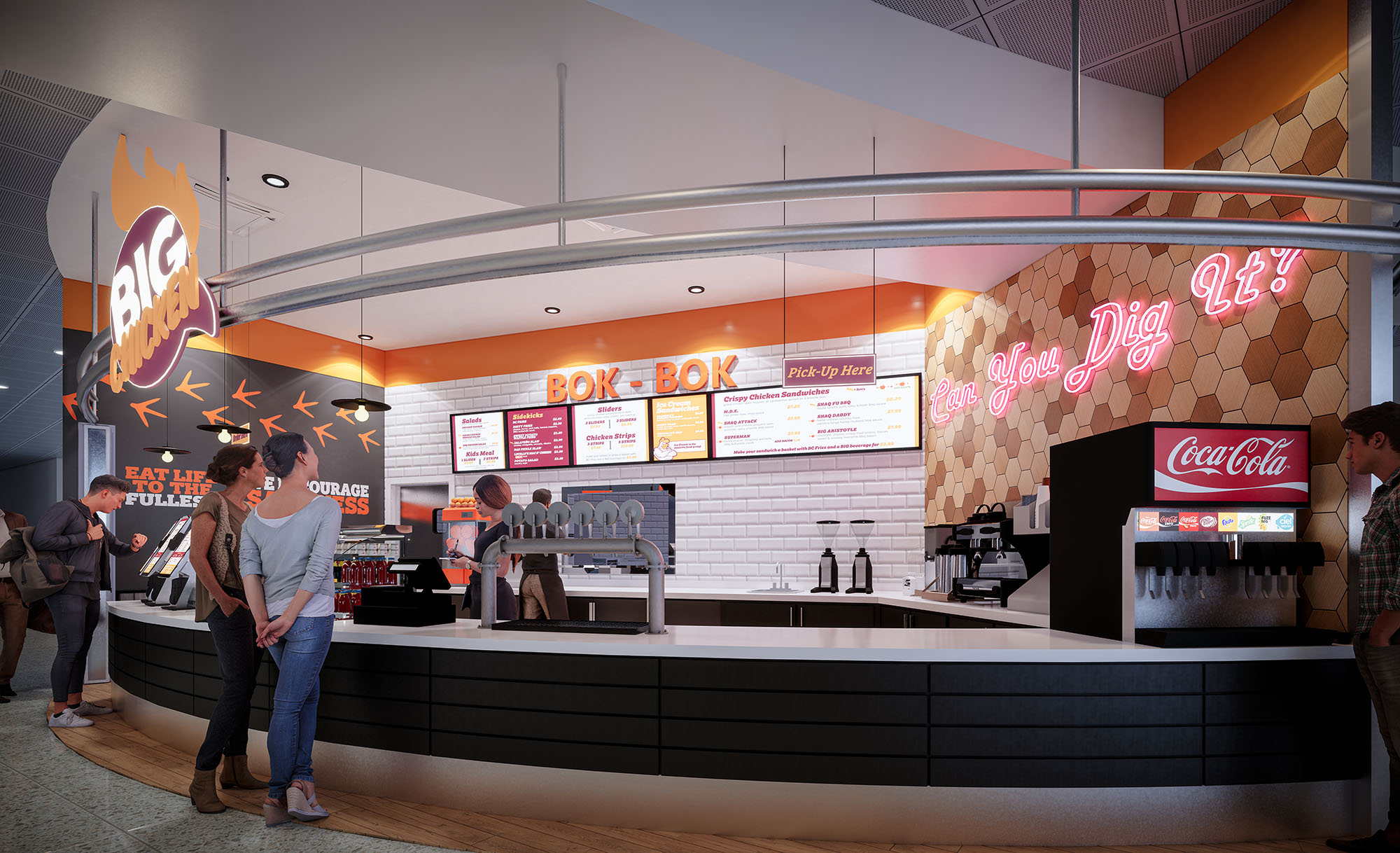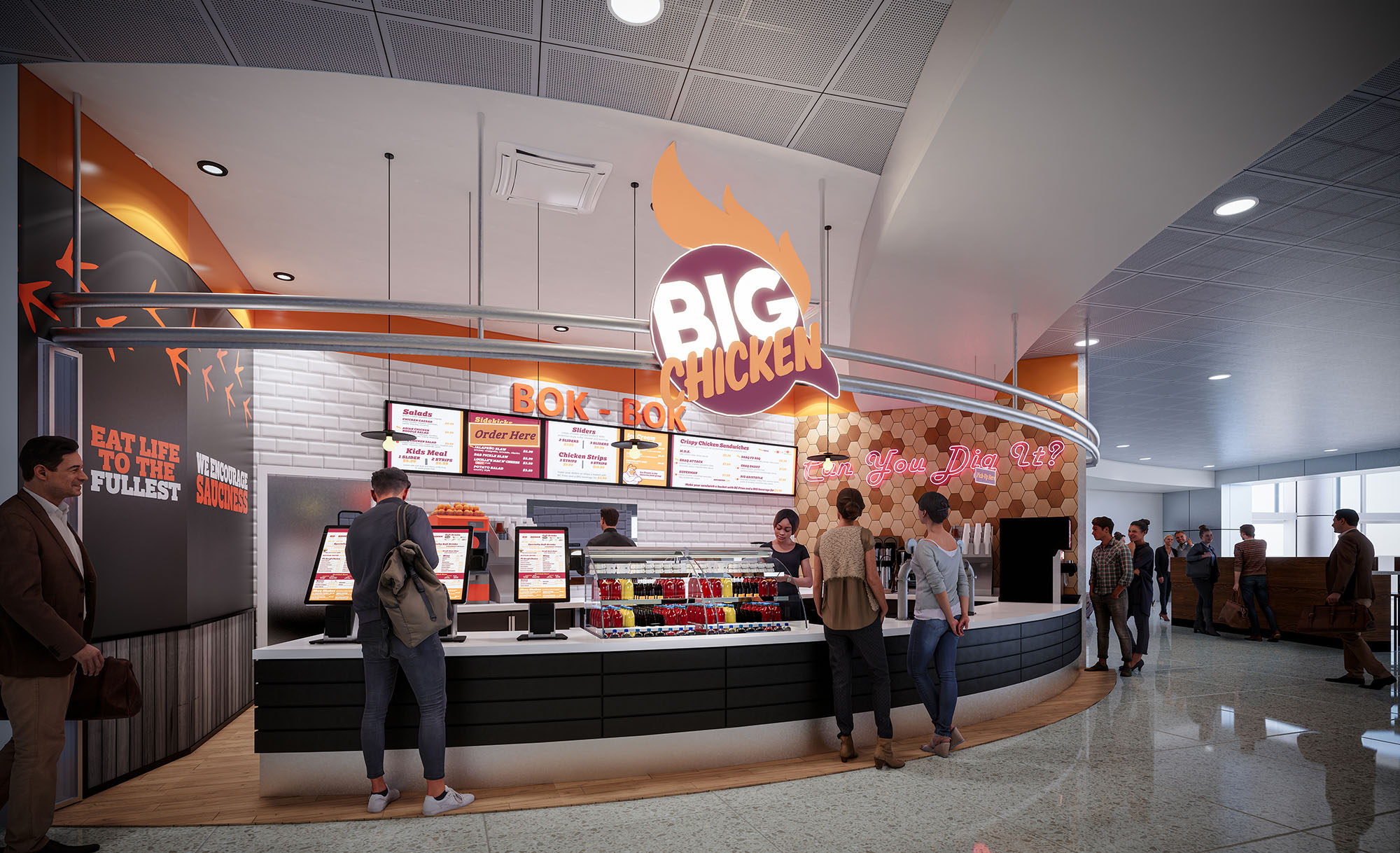 BIG CHICKEN in Miami is conceived as a bold, high‑impact quick‑service environment that translates the energy of a vibrant food brand into spatial form. The design amplifies the playful identity through oversized graphic elements, neon statements, and a warm, appetizing palette centered on oranges, yellows, and charcoals. The architectural strategy focuses on creating a clear, legible front‑of‑house experience that supports rapid service, digital ordering, and strong visual recognition within a busy retail or transit context.