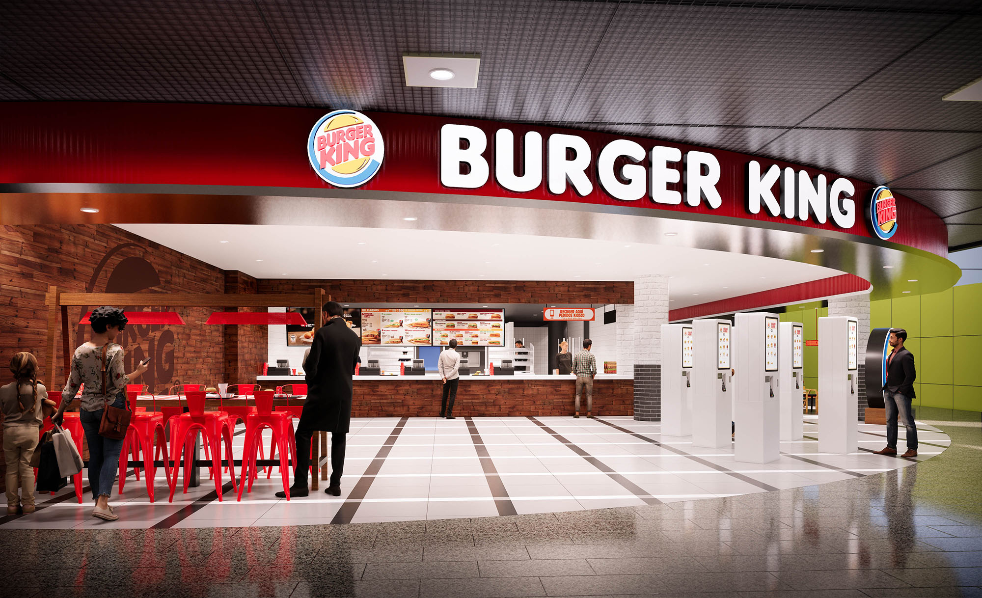 Architectural and graphic elements are closely coordinated to reinforce the Burger King identity without resorting to excessive signage. Large illuminated logotypes and red cornices define the storefronts, acting as beacons within busy shopping centers. Inside, wall graphics, framed imagery and typography narrate the brand’s association with flame‑grilling and casual enjoyment, turning otherwise blank surfaces into storytelling devices.