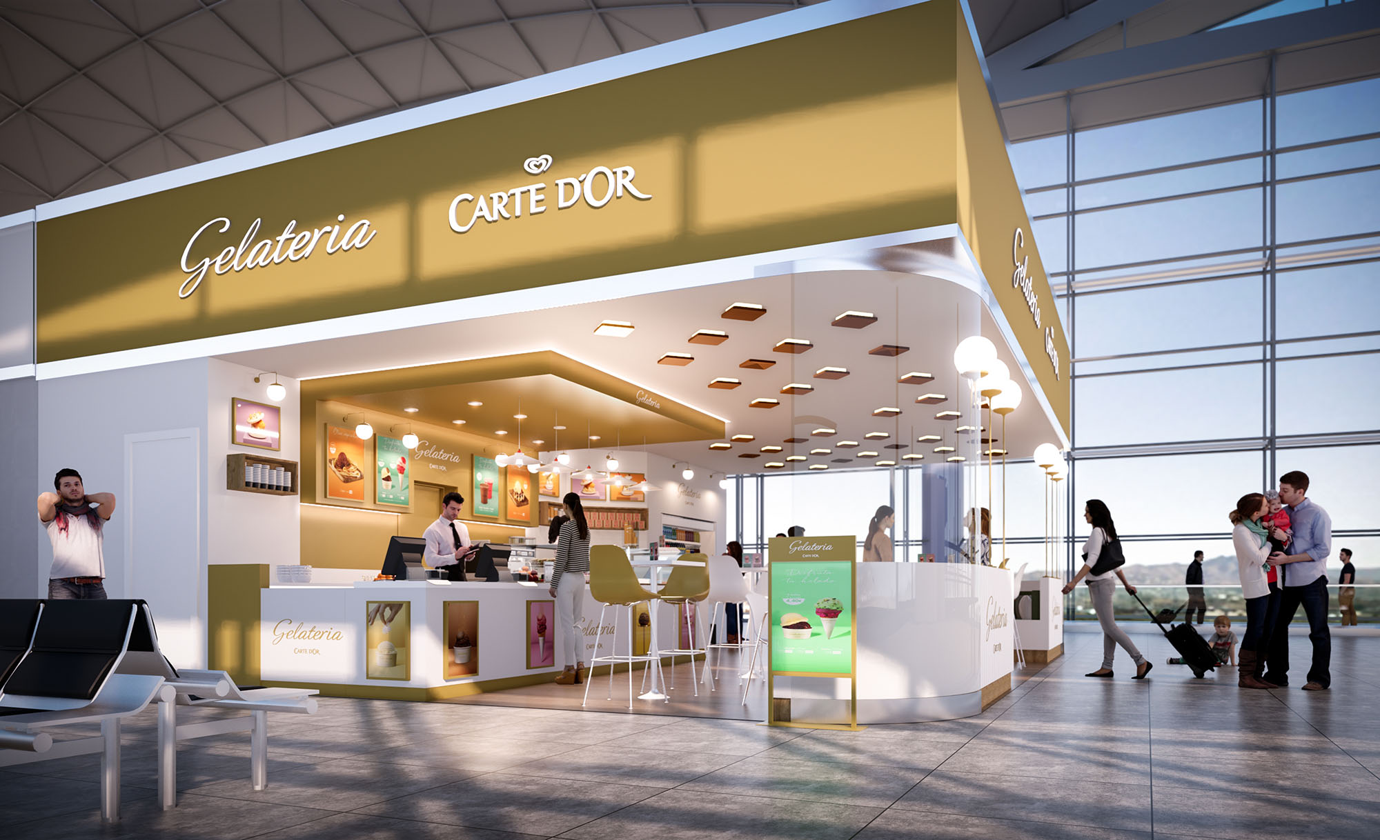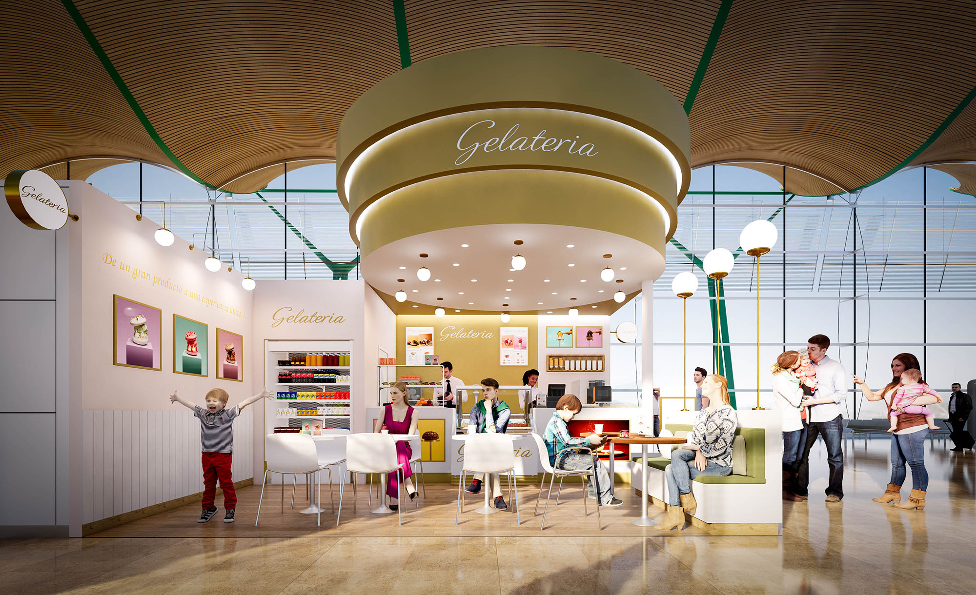 The Carte d’Or project is conceived as a family of gelato spaces that can inhabit multiple contexts in Spain—airports, shopping centres and outdoor plazas—while remaining instantly recognizable. The concept translates the sensorial qualities of artisanal ice cream into spatial form: softness, lightness and generosity are expressed through rounded geometries, warm lighting and a chromatic palette derived from cream, caramel and pistachio tones. Each unit operates as a luminous island within its host environment, creating a moment of pause and indulgence in otherwise transitional spaces.