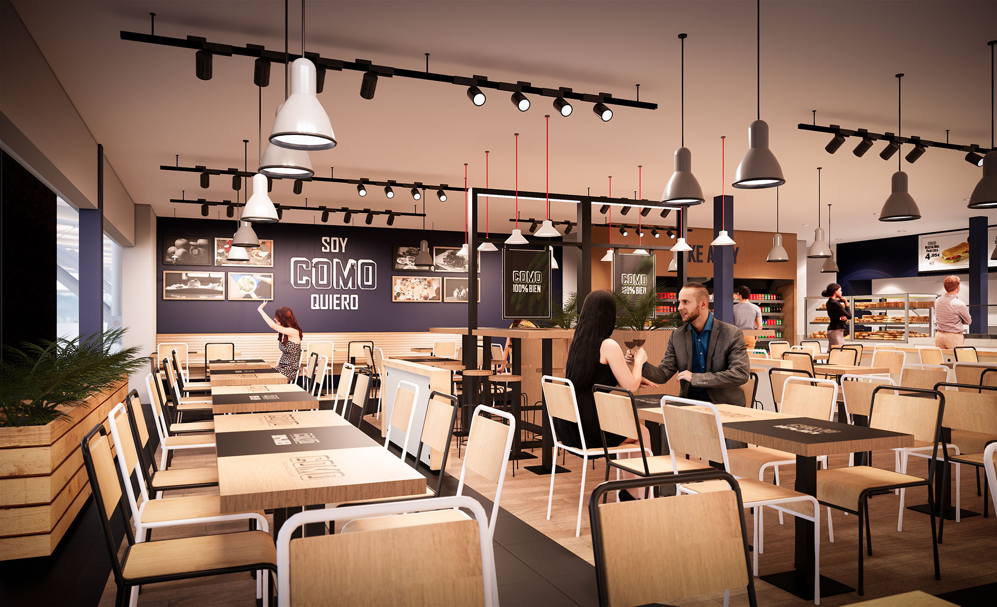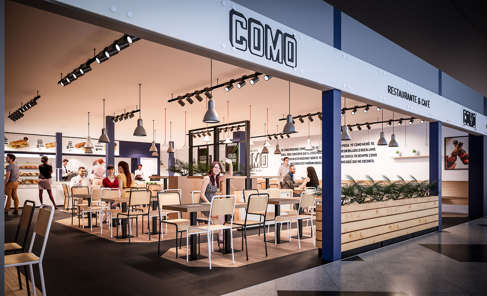 COMO is conceived as a contemporary fast‑casual restaurant brand that can be replicated in multiple Iberian locations while maintaining a clear and recognizable identity. The design language combines the efficiency of a food court kiosk with the warmth of a neighborhood café, using a palette of light woods, neutral tones and precise graphic elements. The architecture privileges visual permeability, allowing the interior atmosphere to extend into the surrounding circulation areas and inviting spontaneous access.