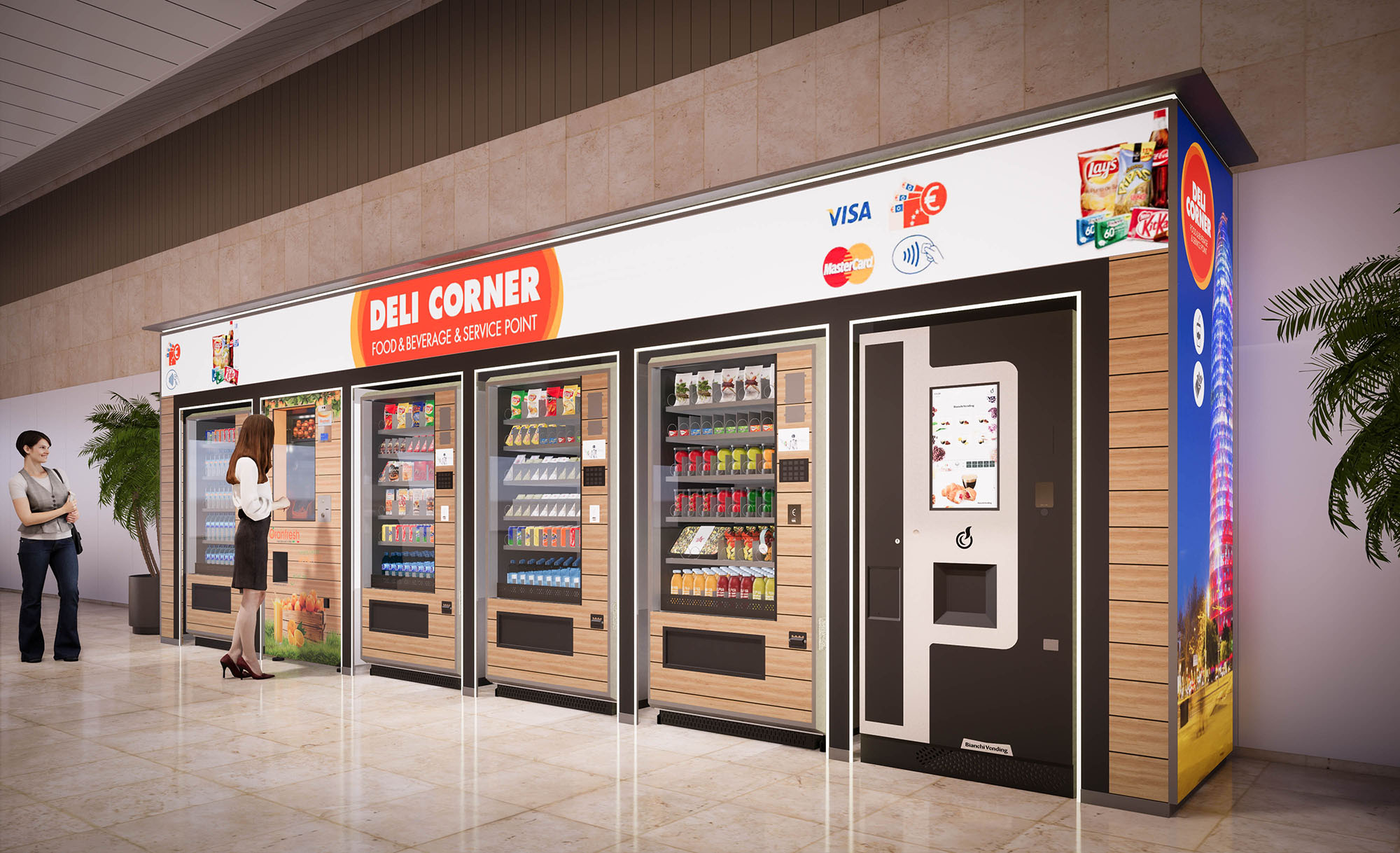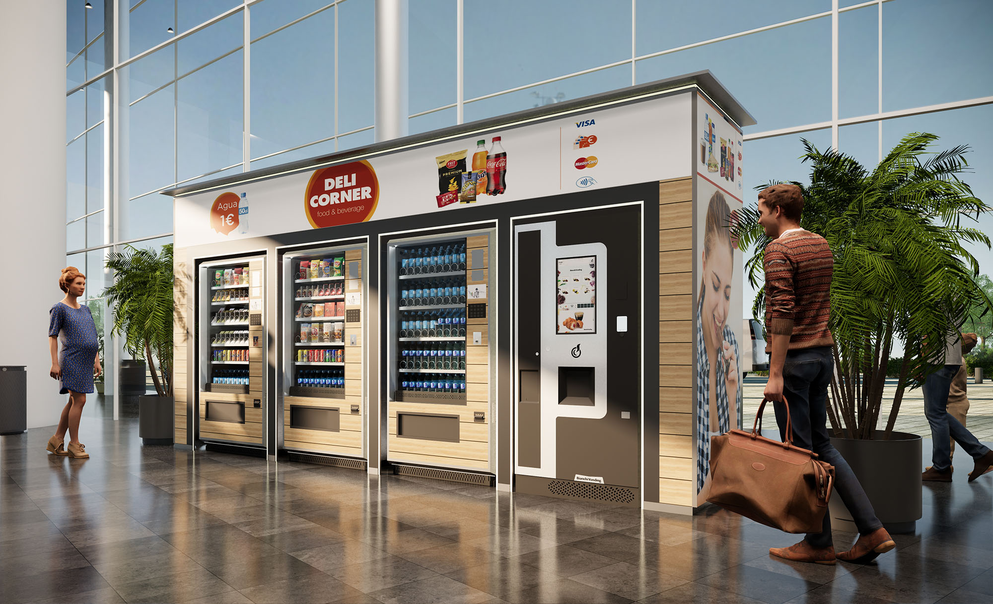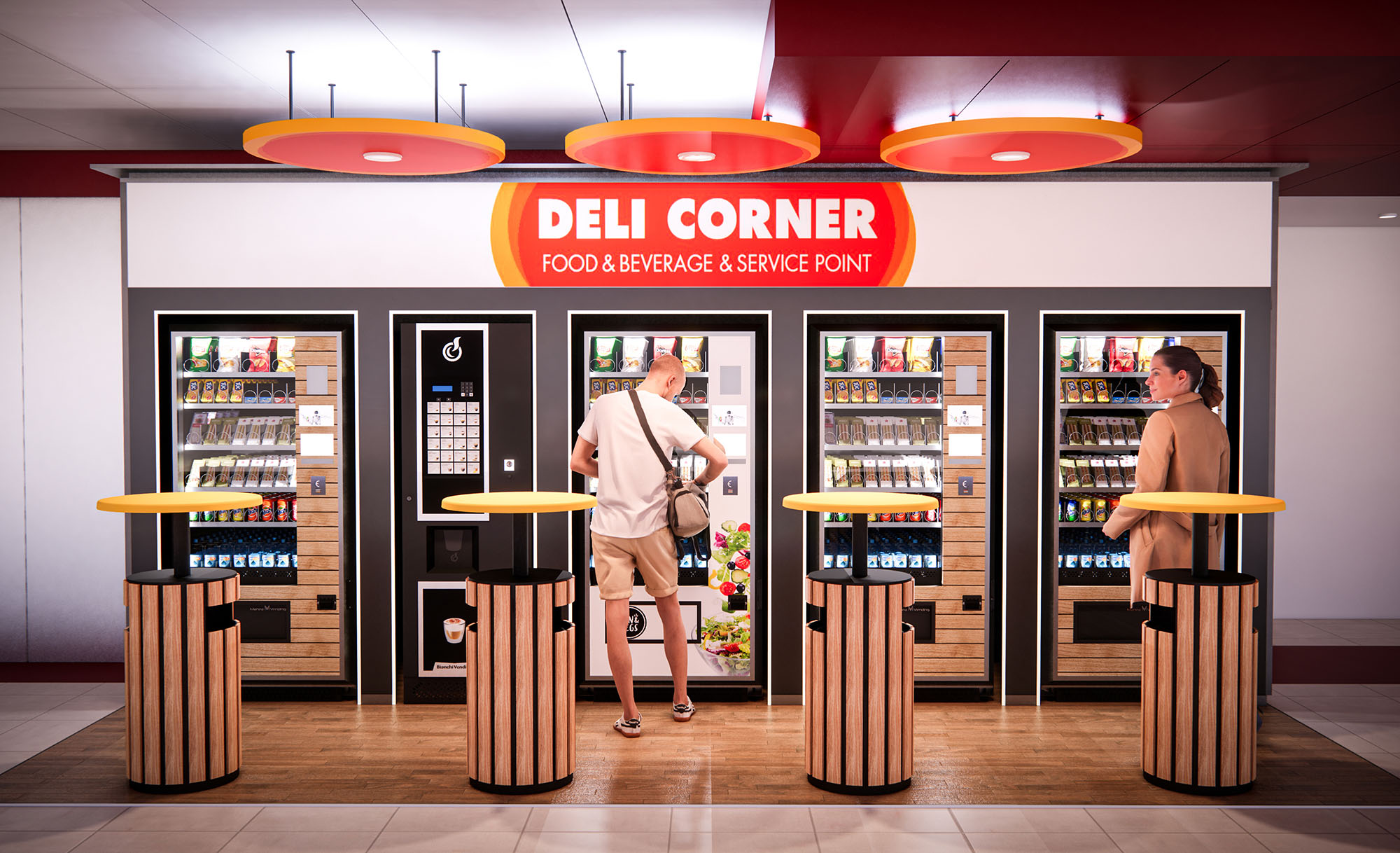 The material palette balances robustness with a warm, approachable character. Structural frames and machine surrounds are expressed in dark metallic finishes, providing durability and a clear technical language for the equipment. In contrast, horizontal surfaces and soffits are clad in wood-effect panels, introducing a domestic warmth that differentiates Deli Corner from the typically hard, infrastructural environment of airport concourses.