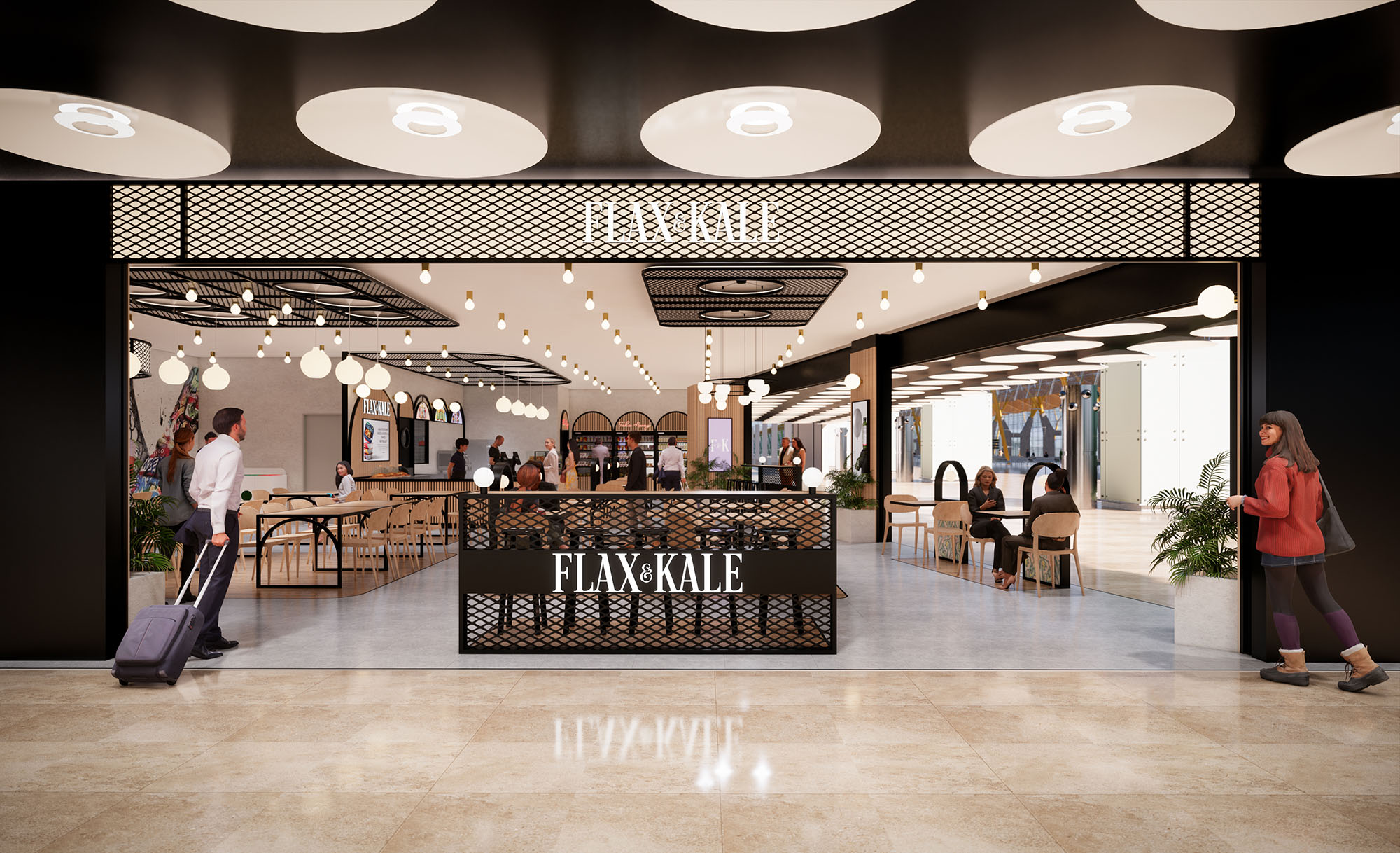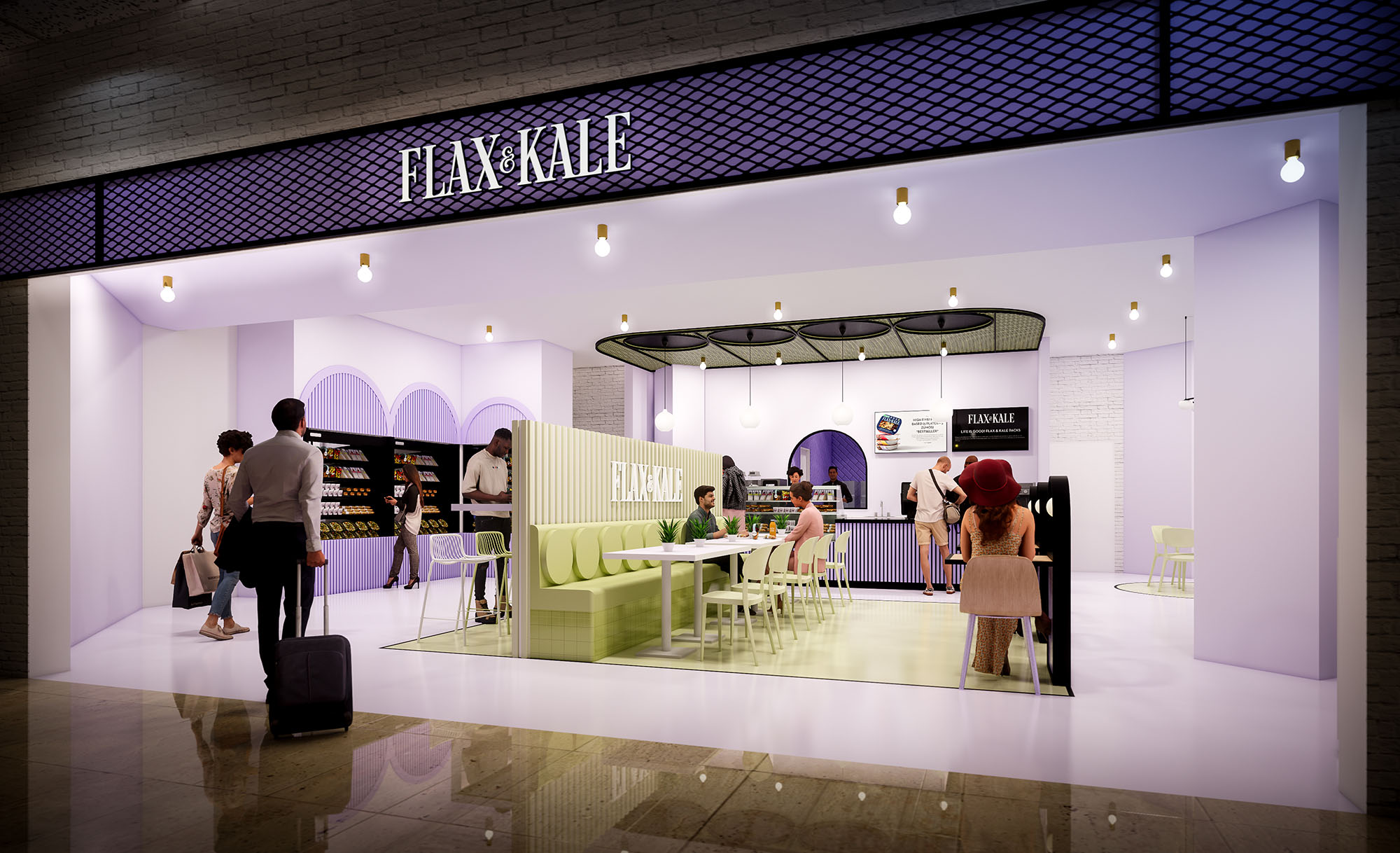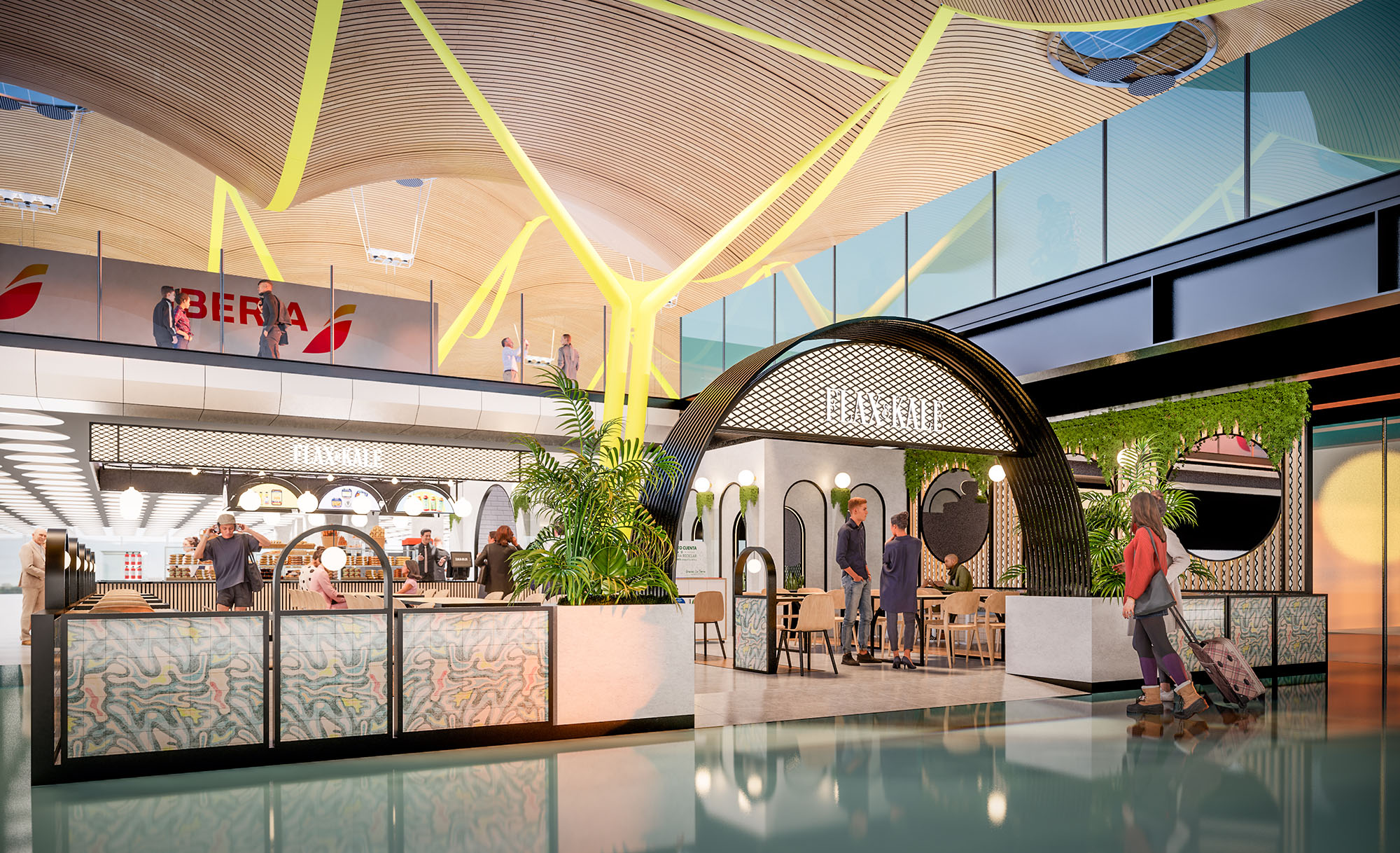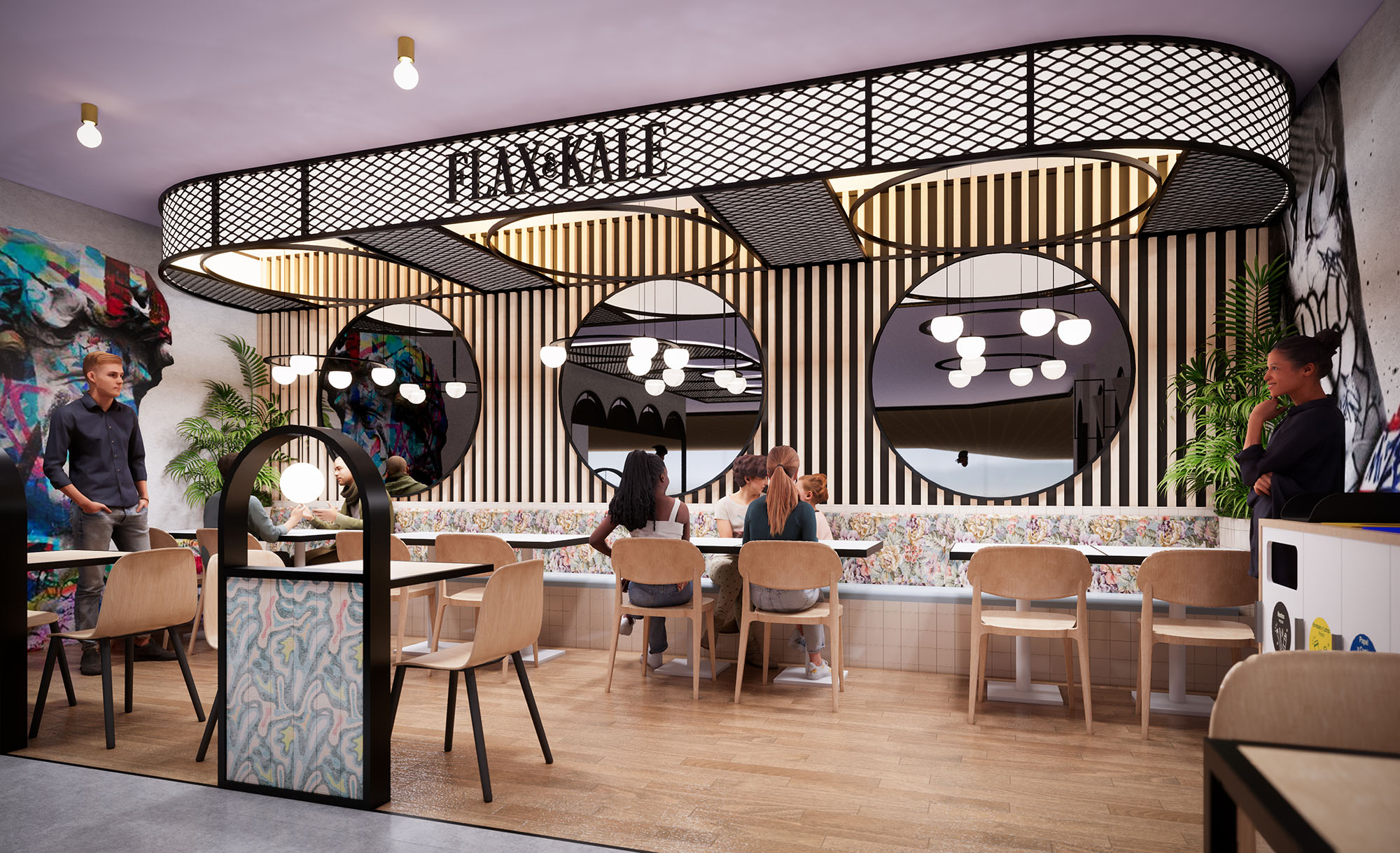 The design of FLAX & KALE in Madrid translates the brand’s flexitarian philosophy into a spatial experience that is fresh, playful and highly legible within the commercial context. The concept works with a soft‑toned, almost pastel chromatic palette contrasted by precise black outlines and metallic details, creating a graphic, contemporary identity that is recognizable from a distance. The restaurant is conceived as an open pavilion inside the mall, dissolving the boundary between corridor and interior to invite spontaneous access throughout the day.
