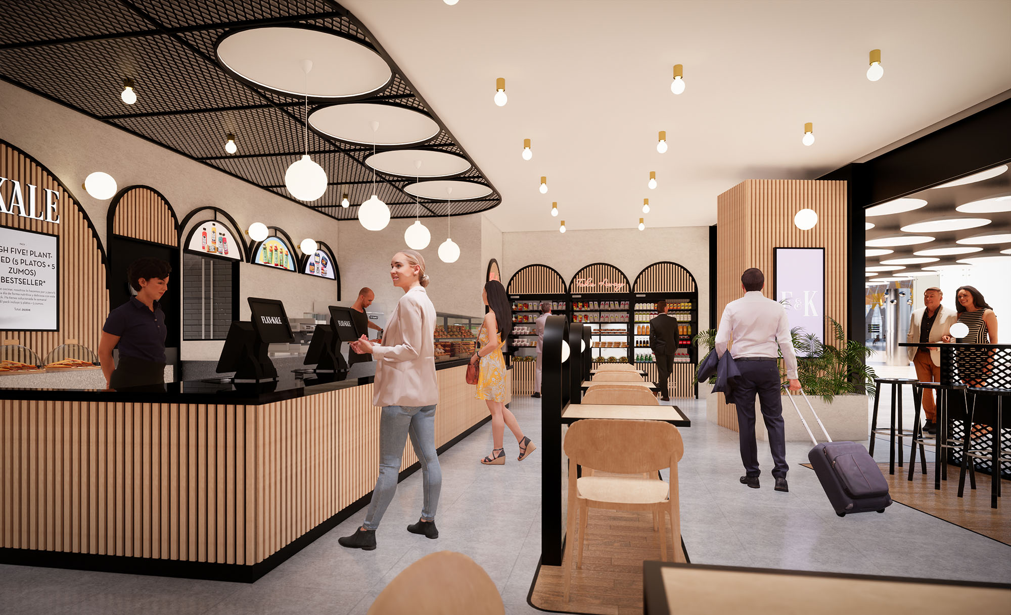 Branding is seamlessly embedded in the architecture through backlit logos, patterned mesh fascias and color zoning on floors and walls. Each view line from the mall reveals a combination of signage, arches and illuminated counters, ensuring strong recognizability. The overall user experience prioritizes clarity of use, spatial generosity and a memorable visual language that aligns with a contemporary, health‑driven gastronomic proposal.