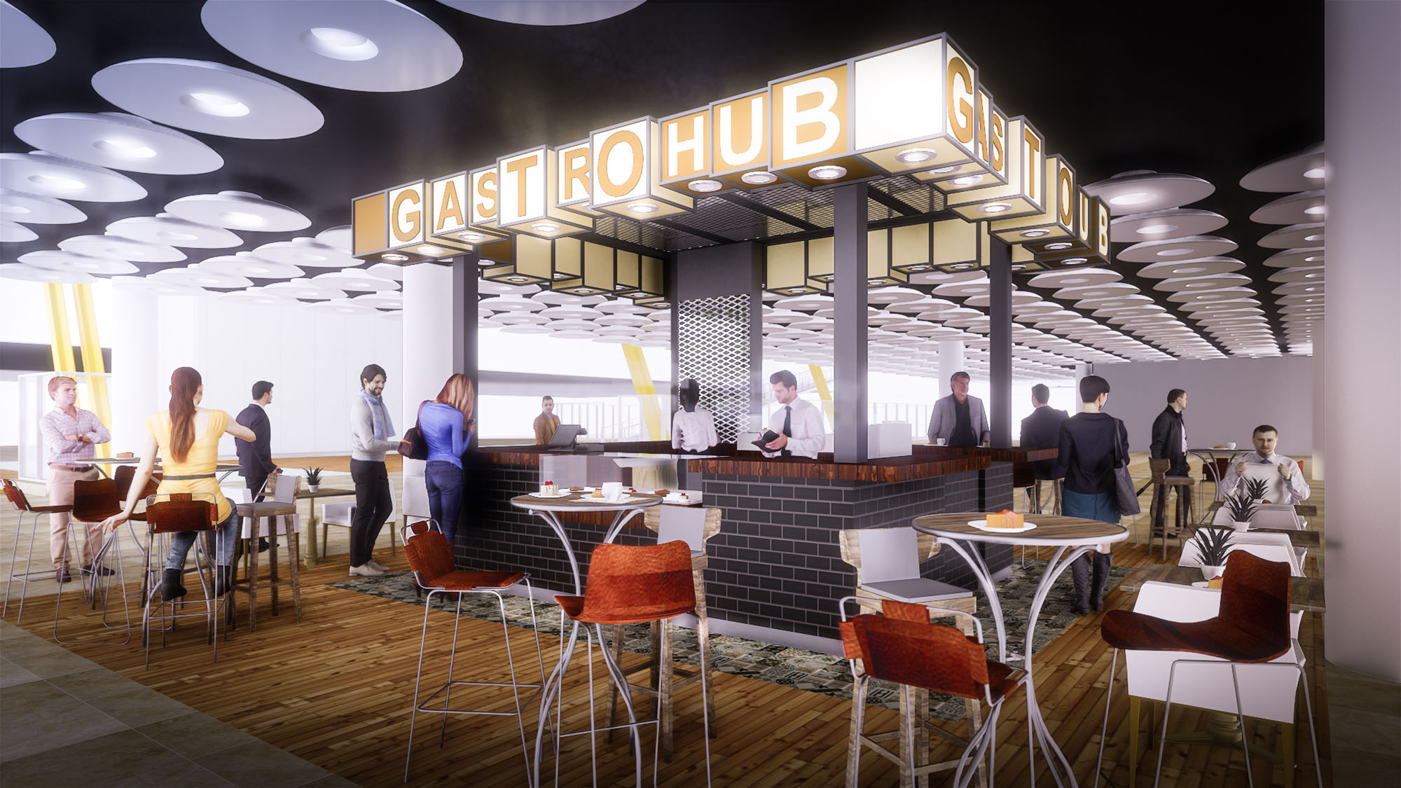 GASTROHUB is conceived as a cosmopolitan gastronomic platform that can be replicated across different countries while adapting to local cultures. The concept merges the informal vibrancy of a food market with the precision and comfort of a contemporary restaurant. A strong, recognizable identity is created through the illuminated volumetric signage, the use of black and white as the primary chromatic base, and a clear modular logic that structures bars, dining zones and circulation areas.