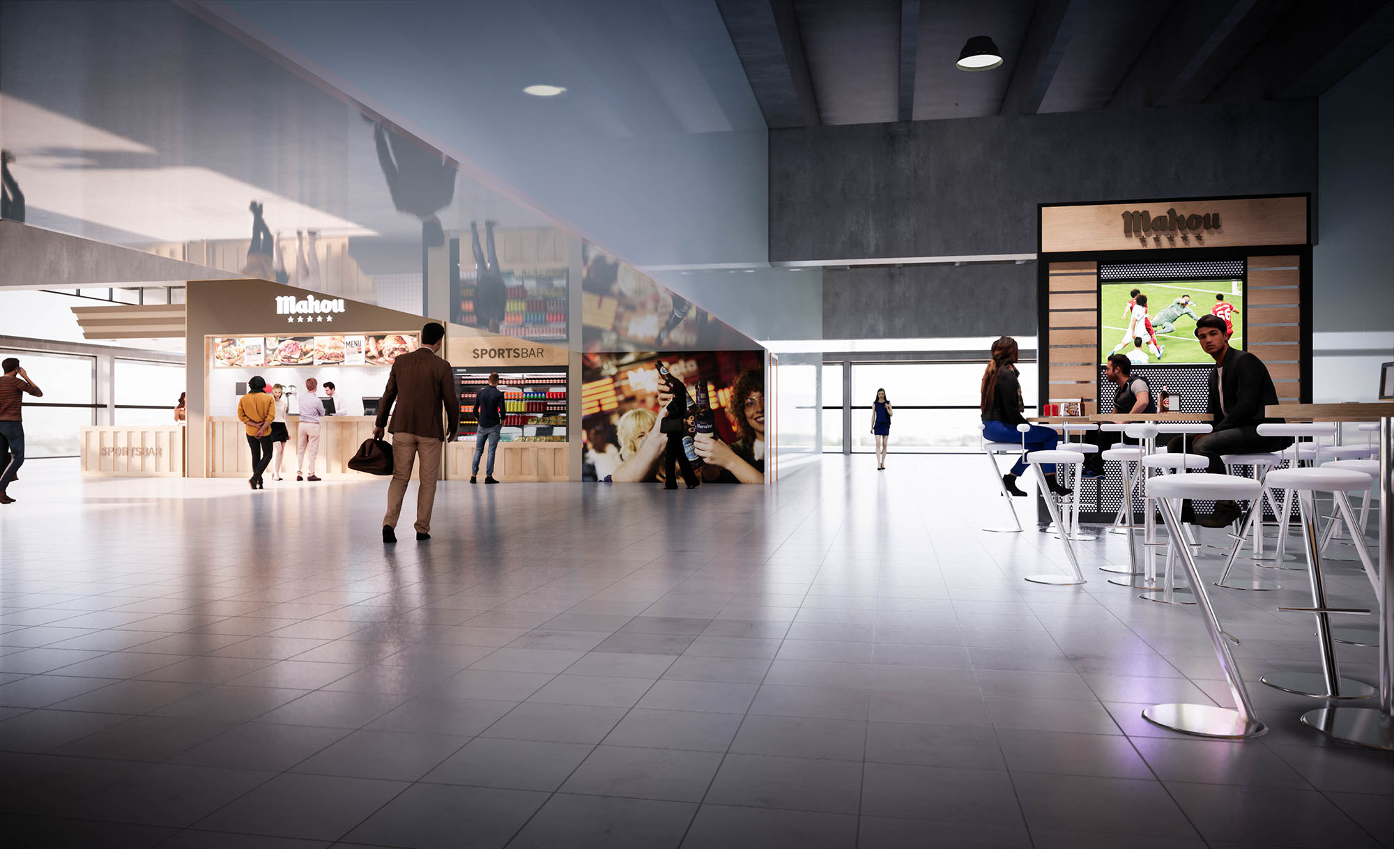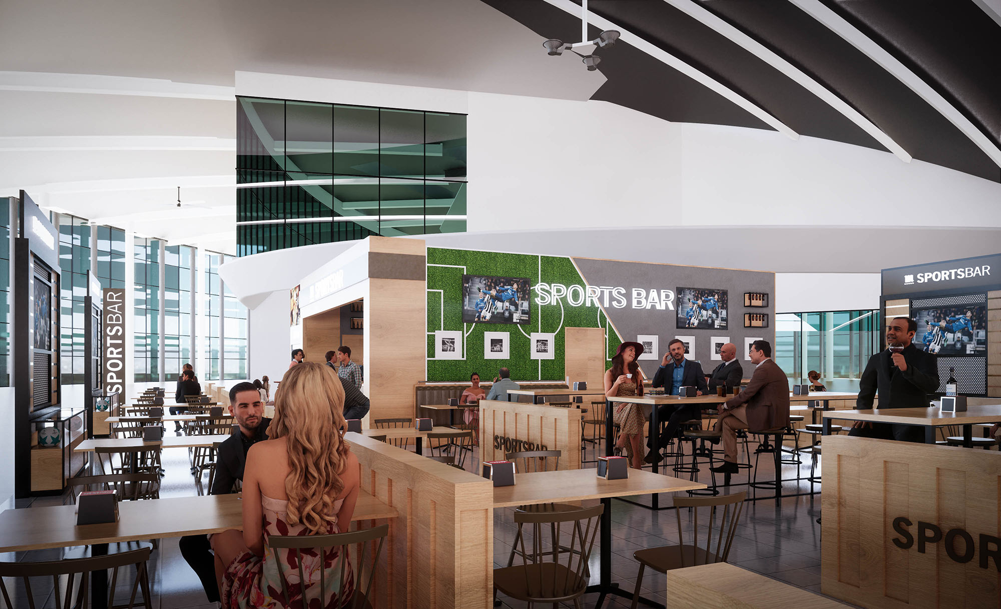 Operational efficiency is supported by clear queuing zones, visible menu bands, and self-service display areas that reduce waiting times. Acoustic comfort is enhanced through soft finishes on selected walls and soffits, as well as the strategic positioning of screens and speakers to localize sound around the sports viewing areas without disturbing adjacent terminal spaces.