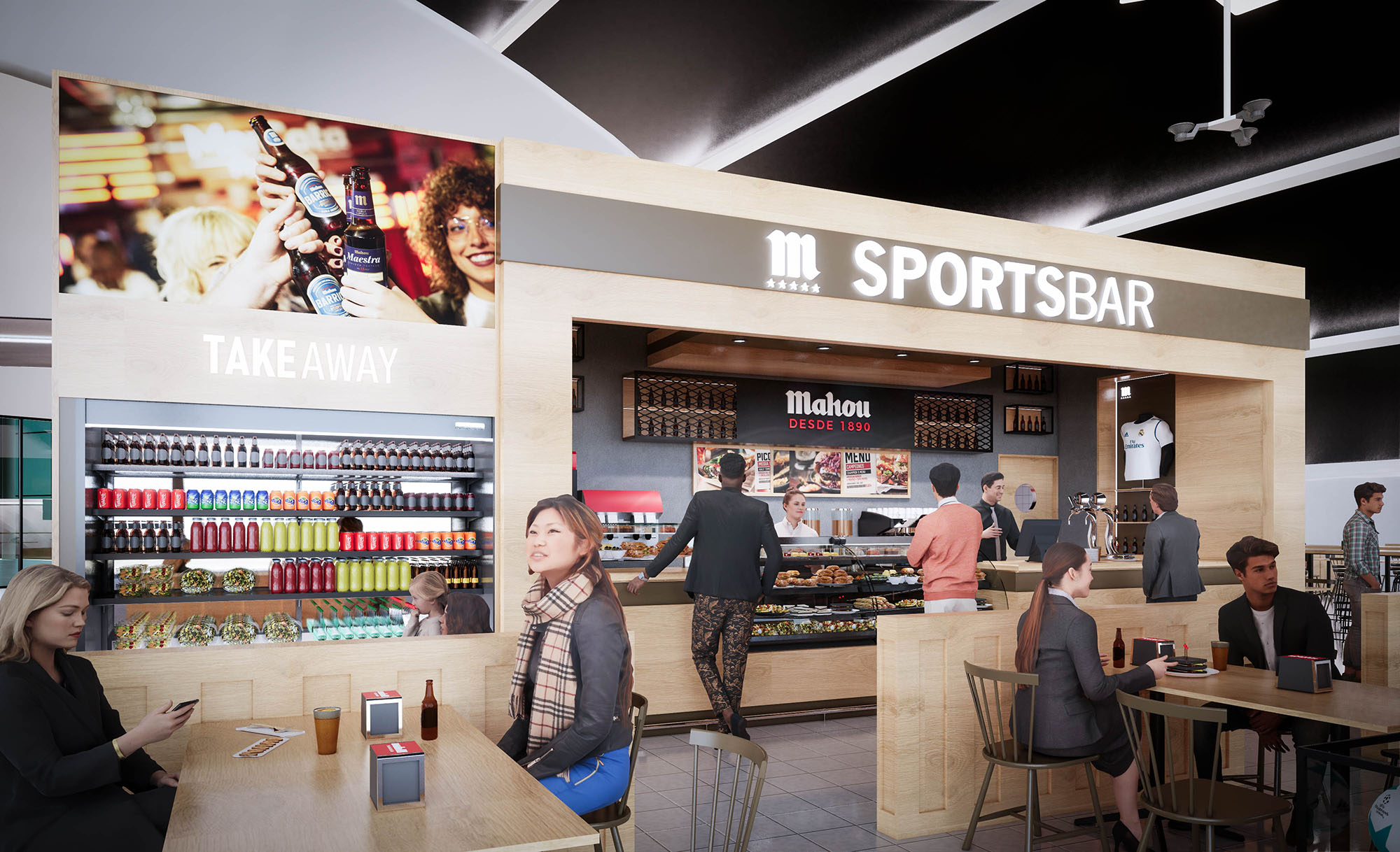 Mahou Sport Bar is conceived as a modular hospitality concept capable of adapting to different airport and transport-hub locations across Spain while maintaining a powerful and recognizable brand image. The project merges the vocabulary of contemporary sports arenas with the clarity of a fast-service bar, using strong geometry, bold color blocks, and open sight lines to promote visibility and intuitive circulation.