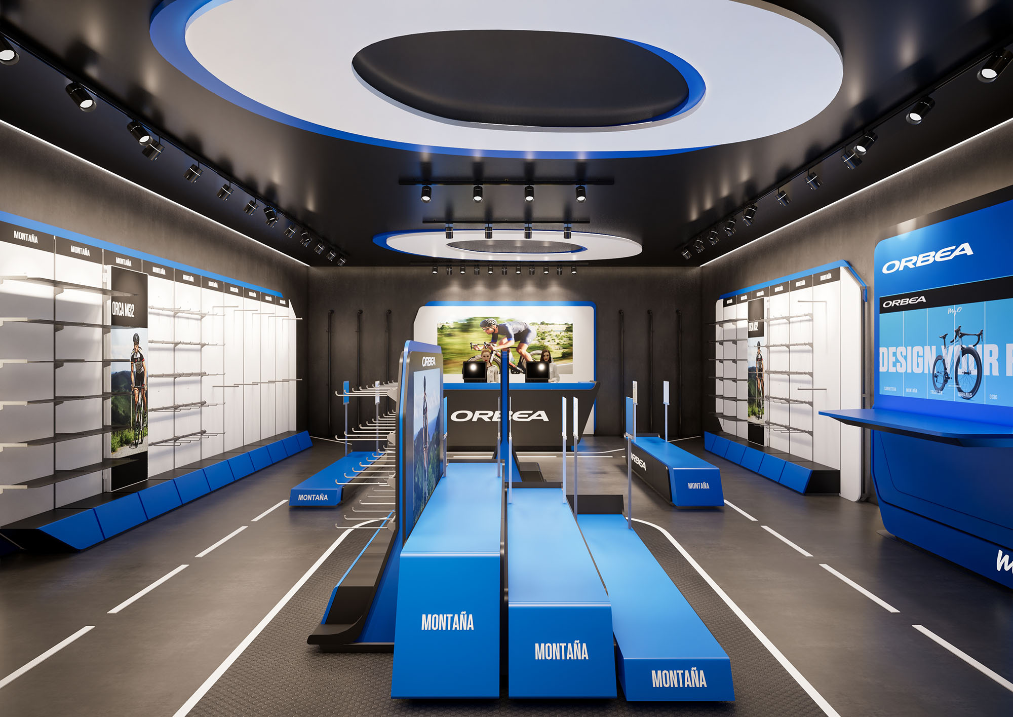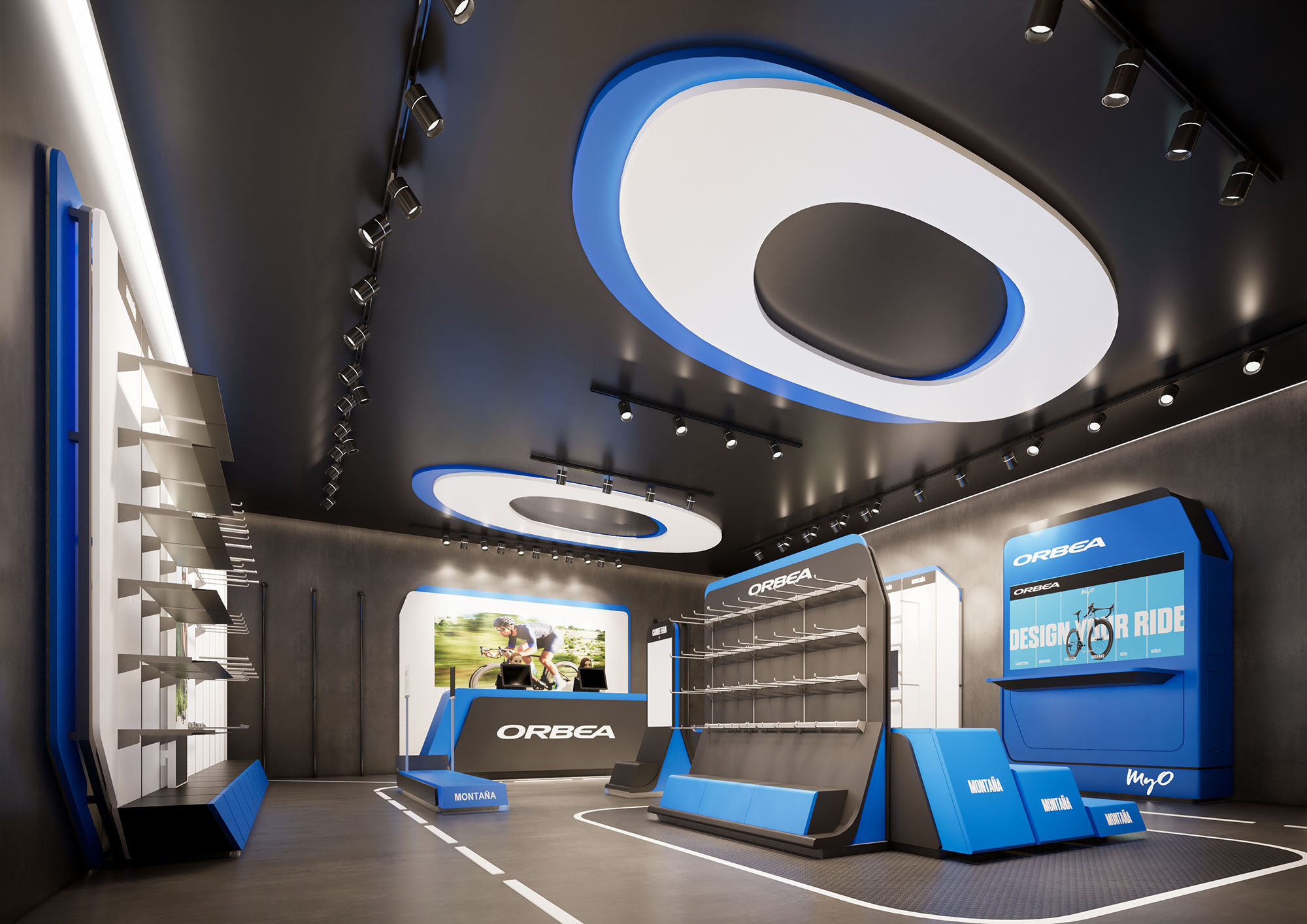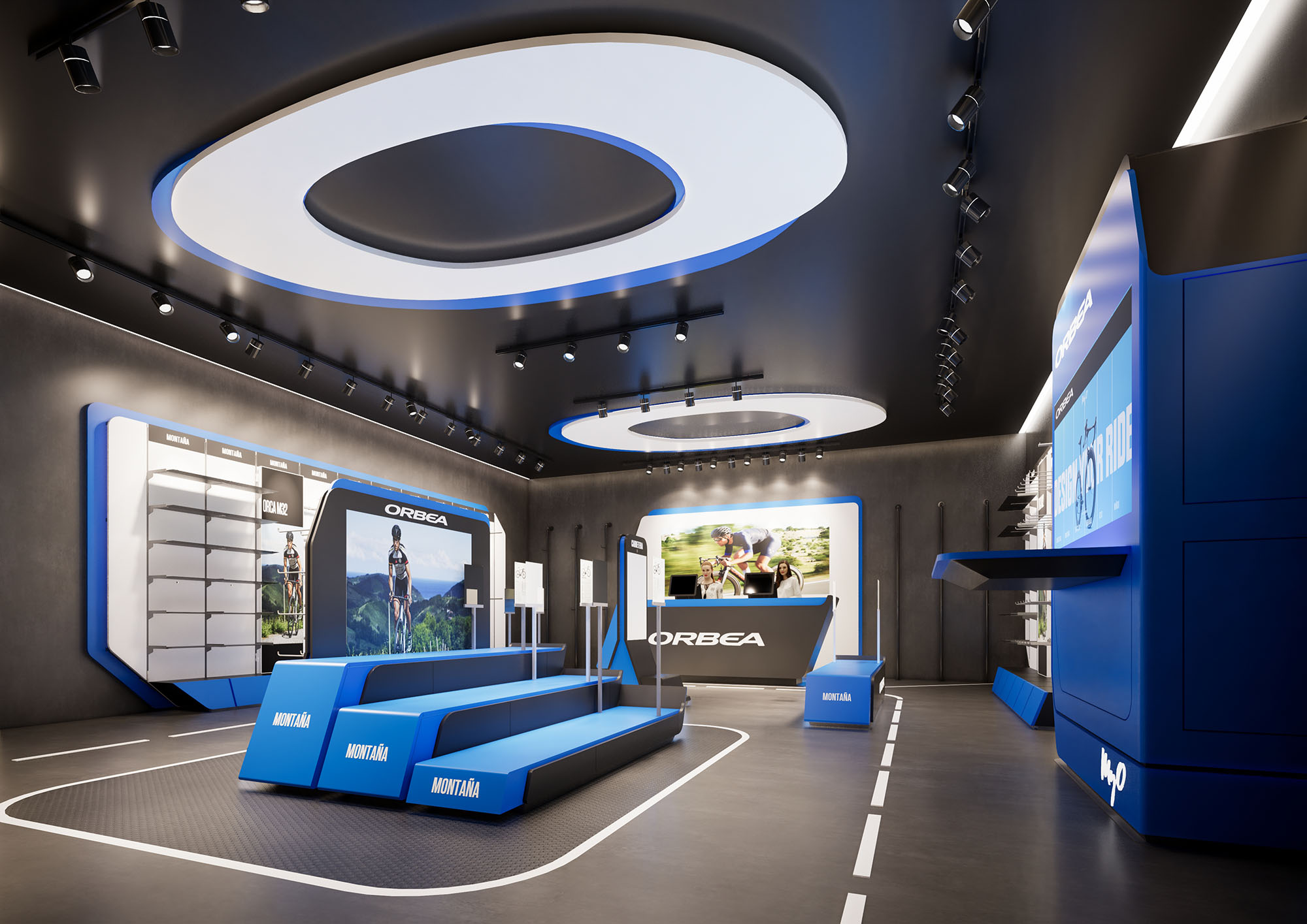 ORBEA blue is deployed as a structural element: it forms the volumetric frames of the display walls, the edges of the counters, and the central islands, creating a continuous chromatic thread. White planes are used selectively to highlight product areas and increase perceived brightness at eye level. Black accents in profiles, fixtures and lighting tracks add definition and a technical character consistent with high‑performance sports equipment.