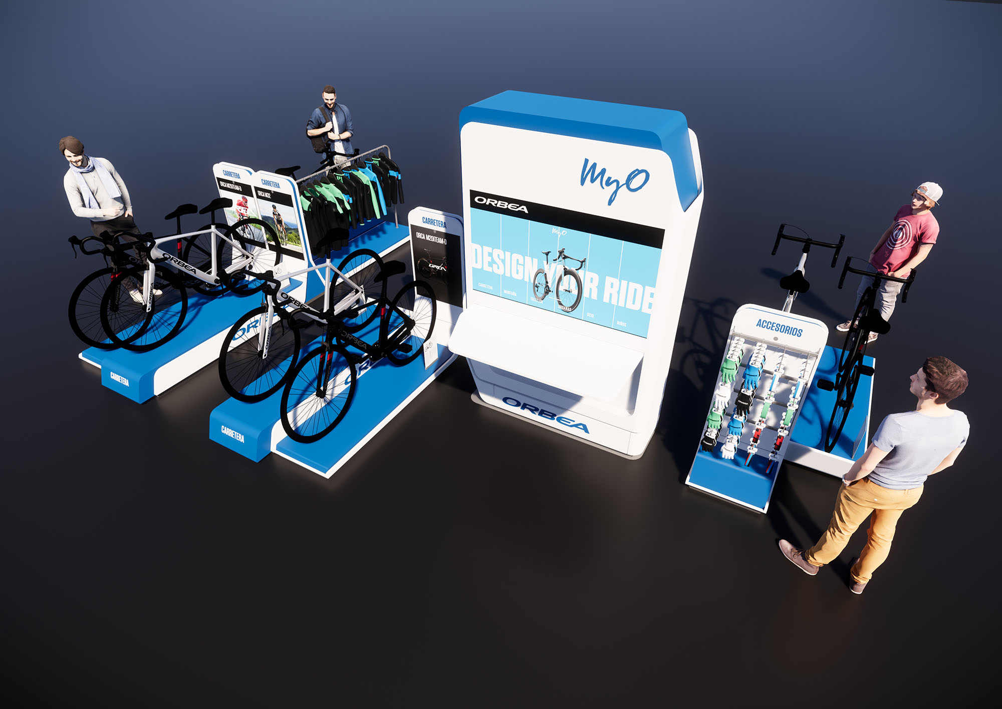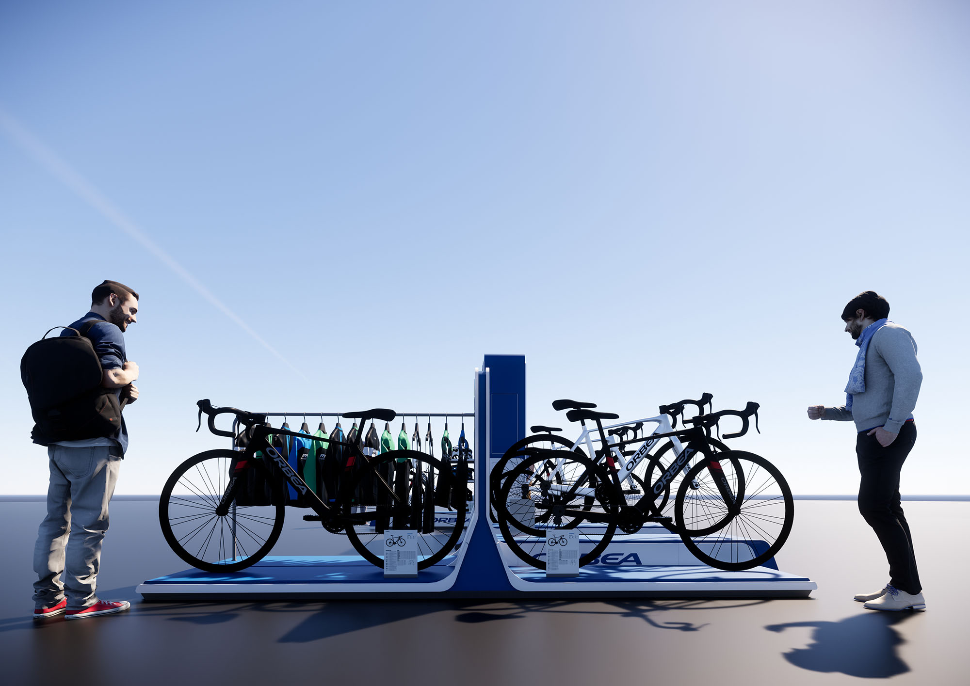 The central blue platforms act as stages for hero products, special editions or bike fitting demonstrations. Freestanding totems accommodate digital screens and wayfinding information, while broad counters provide areas for configuration services and after‑sales support. All elements are dimensioned to maintain maximum transparency across the store, preserving long visual perspectives and avoiding visual clutter.