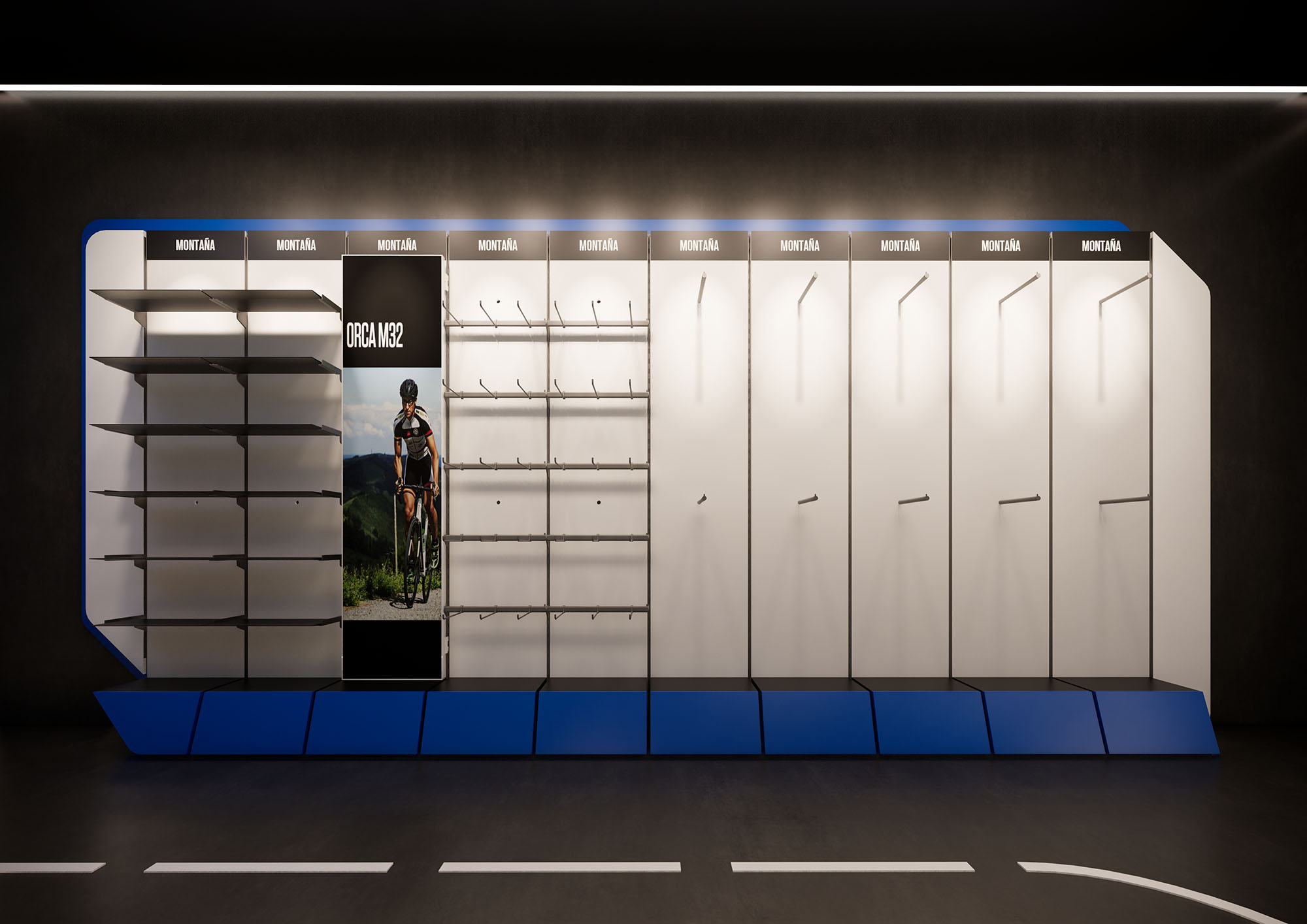The furniture is conceived as an integrated system rather than isolated pieces. Perimeter walls feature modular panels with interchangeable brackets, shelves and hooks, allowing quick reconfiguration for different product typologies. The base volumes, inclined and faceted, echo the geometry of frames and helmets, subtly referencing the mechanics of cycling.