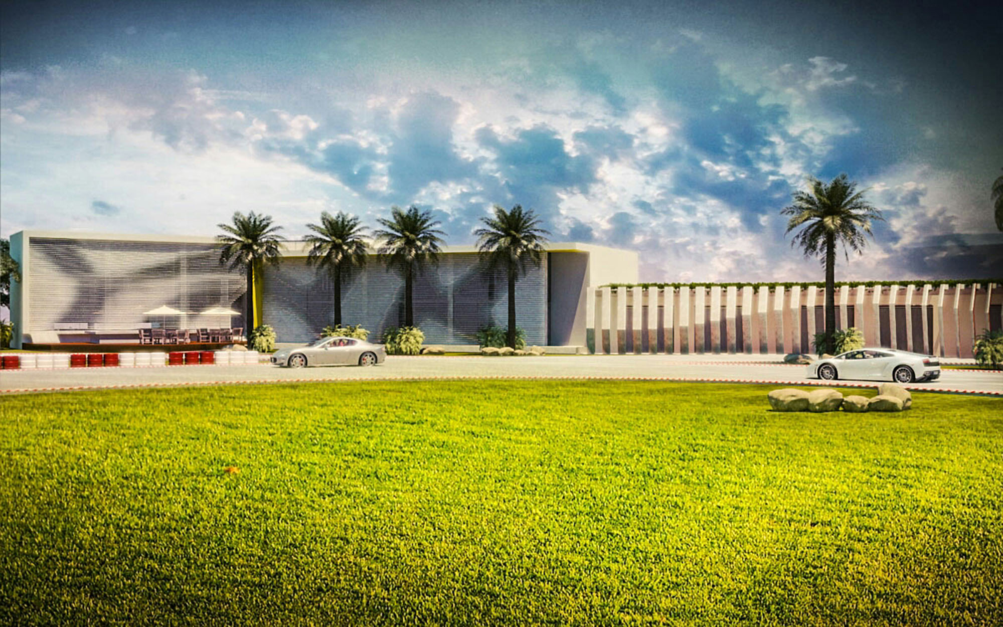 The main architectural volumes are resolved as clean, rectilinear prisms that host workshop bays, showrooms, support services and hospitality areas. These boxes are interspersed with deep porticos and shaded outdoor terraces that encourage interaction and visual continuity with the landscaped areas. Large car courts and maneuvering zones are seamlessly integrated, maintaining clear separation between pedestrian promenades and vehicular circulation for safety and comfort.