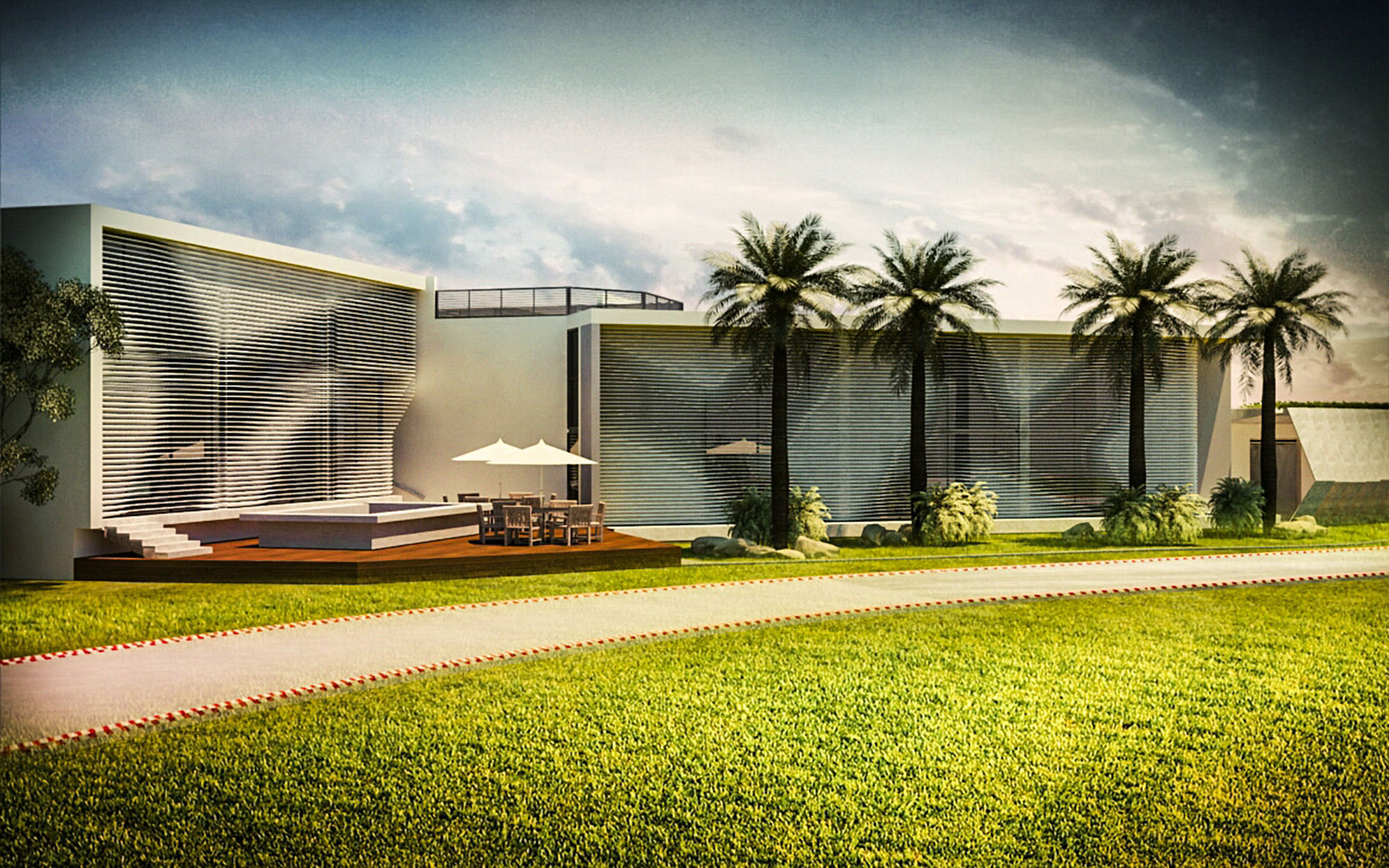 The rhythm of vertical elements along the enclosure wall introduces a sense of speed and vibration, as if the architecture itself were in motion. Transparent spans framed by slender structural members reveal selective interior views, while high-performance glazing minimizes glare. The color palette favors warm neutrals contrasted with strategic accents that can be associated with brand identity or racing graphics, emphasizing the project’s avant-garde character.